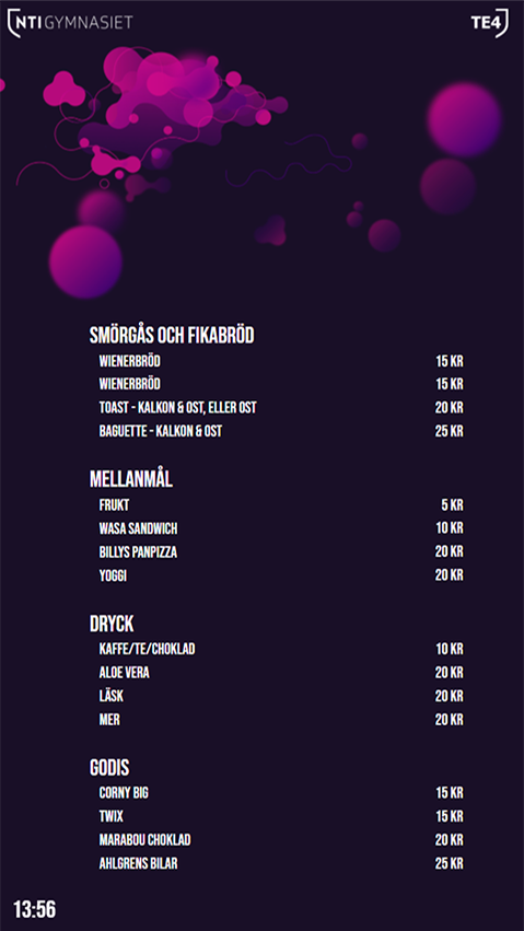 The purpose of this project was to make a screen for the cafeteria that displays the available consumables for purchase, as such, many improvements and additions were made.